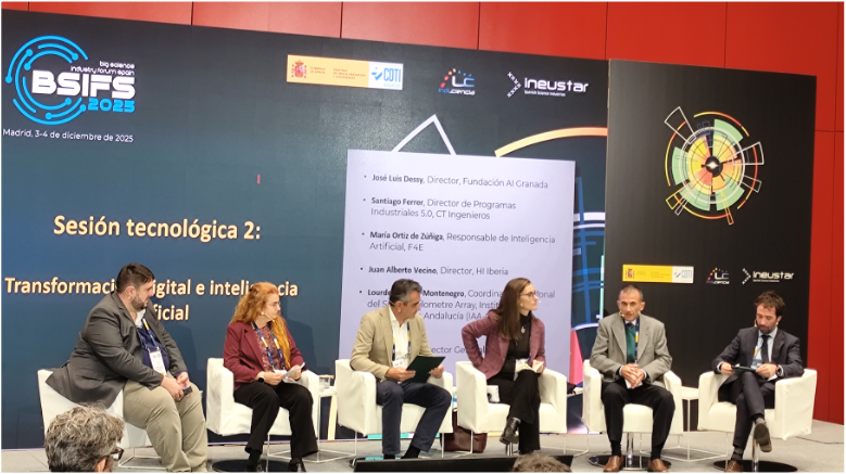 Por otro lado, el proyecto SKA estuvo presente en el Big Science Industry Forum Spain (BSIFS), celebrado los días 3 y 4 de diciembre de 2025. La asistencia de las empresas españolas participantes en el proyecto y del equipo de coordinación de SKA-Spain permitió aportar su experiencia en infraestructuras científicas de referencia como el SKAO, especialmente en aspectos ligados a la gestión de datos a gran escala, ciencia abierta y sostenibilidad. Concretamente, la coordinadora de SKA-Spain, Lourdes Verdes-Montenegro (IAA-CSIC), formó parte de la mesa redonda “Transformación digital e Inteligencia Artificial”. En esta mesa, centrada en la interacción entre ciencia e industria, se abordó el impacto de la inteligencia artificial como motor de cambio tecnológico, productivo y social. Durante su intervención, Verdes-Montenegro destacó el papel del proyecto TED4SKA en el desarrollo de soluciones basadas en inteligencia artificial para optimizar la sostenibilidad energética y la gestión de datos del nodo español de la SRCNet (espSRC), subrayando la necesidad de garantizar la reproducibilidad y fiabilidad de los resultados científicos en un entorno de creciente automatización.