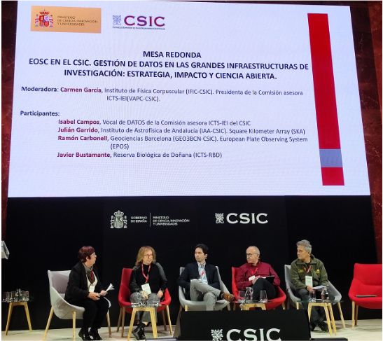 De izquierda a derecha: Carmen García (IFIC-CSIC – Presidenta de la Comisión asesora ICTS-IEI del CSIC y moderadora de la mesa); Isabel Campos (IFCA-CSIC – Vocal de DATOS de la Comisión asesora ICTS-IEI del CSIC); Julián Garrido (IAA-CSIC – co-IP de la coordinación española en SKA); Ramón Carbonell (GEO3BCN-CSIC – vicepresidente de la Comisión asesora ICTS-IEI del CSIC); y Javier Bustamante (EBD-CSIC – vicedirector de la ICTS-DOÑANA).
